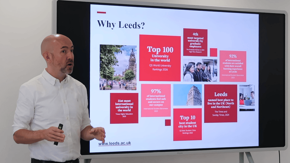他重点说明了"Leeds for Life"学业支持计划、个人导师制度以及职业发展中心提供的就业指导。学校拥有广泛的校企合作网络,并为国际毕业生提供为期18个月的毕业生工作签证,为留英就业创造更多可能。