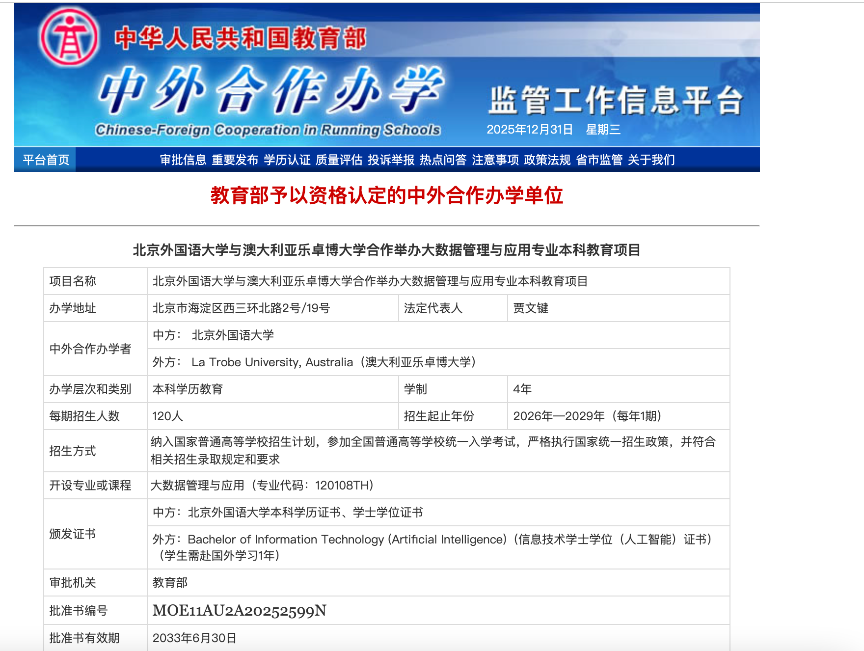 近日,教育部中外合作办学监管工作信息平台公布经批准设立和举办的最新中外合作办学项目名单,北京外国语大学与澳大利亚乐卓博大学合作举办的大数据管理与应用专业本科教育项目通过资格认定,将于2026年秋季启动首批招生。这是北外获批设立的又一重要中外合作办学项目,标志着北外在“人工智能+大数据+管理”交叉学科领域的国际化办学布局取得新进展。
