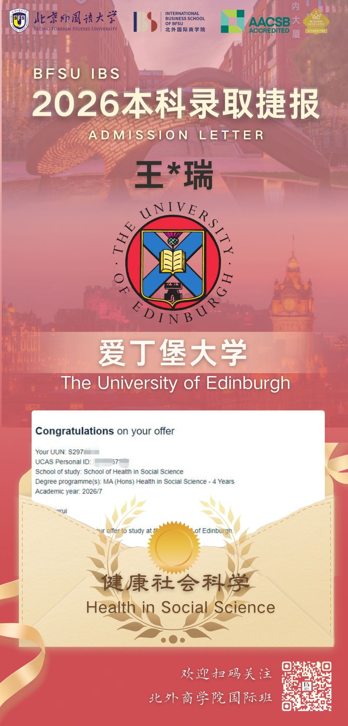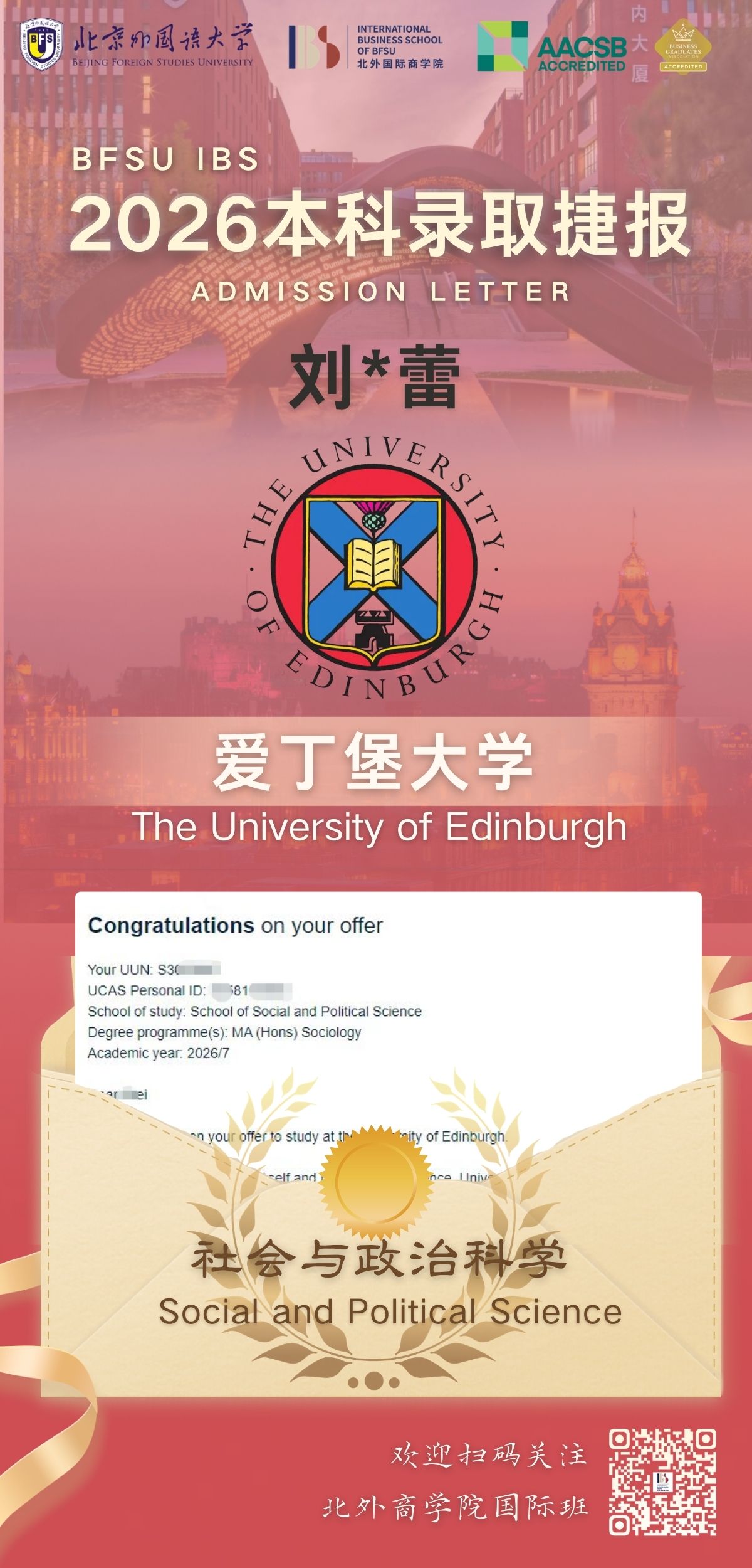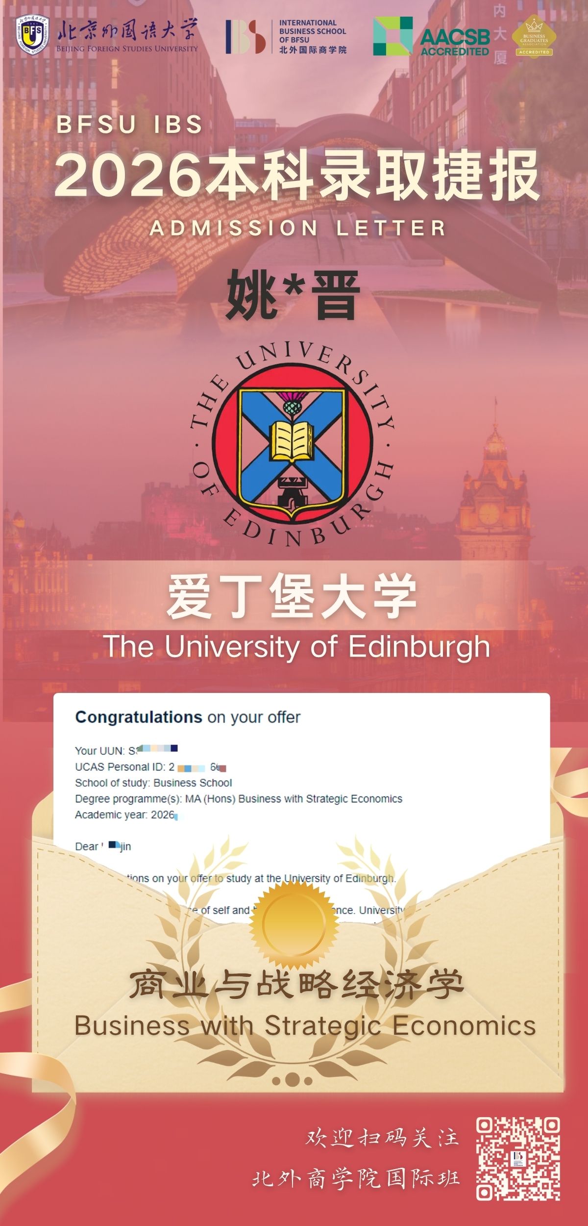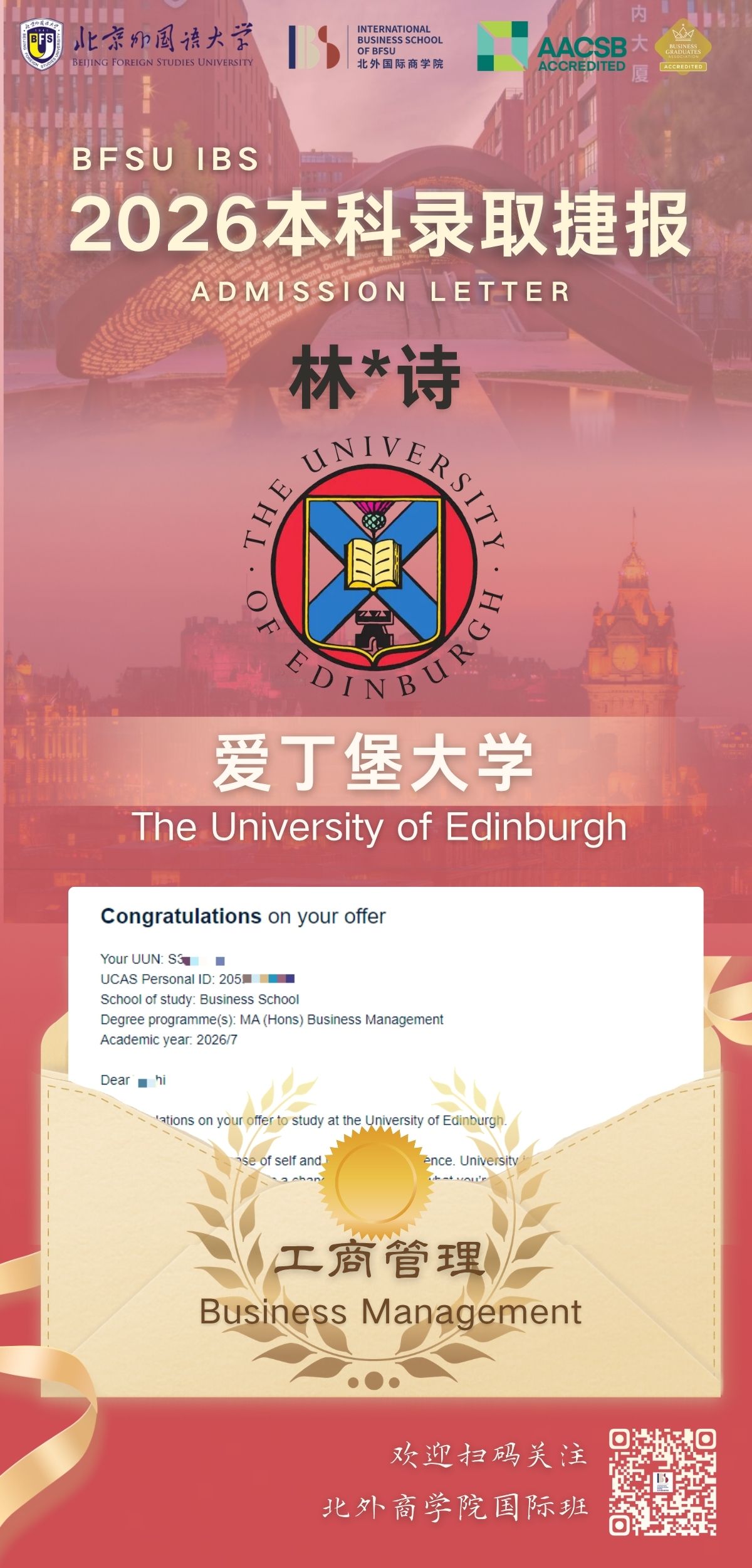 2026 海外升学申请季喜讯不断传来。北京外国语大学国际商学院 iMAP国际教育项目(原经济管理国际项目),再迎佳绩!项目学子收获4枚爱丁堡大学录取通知。