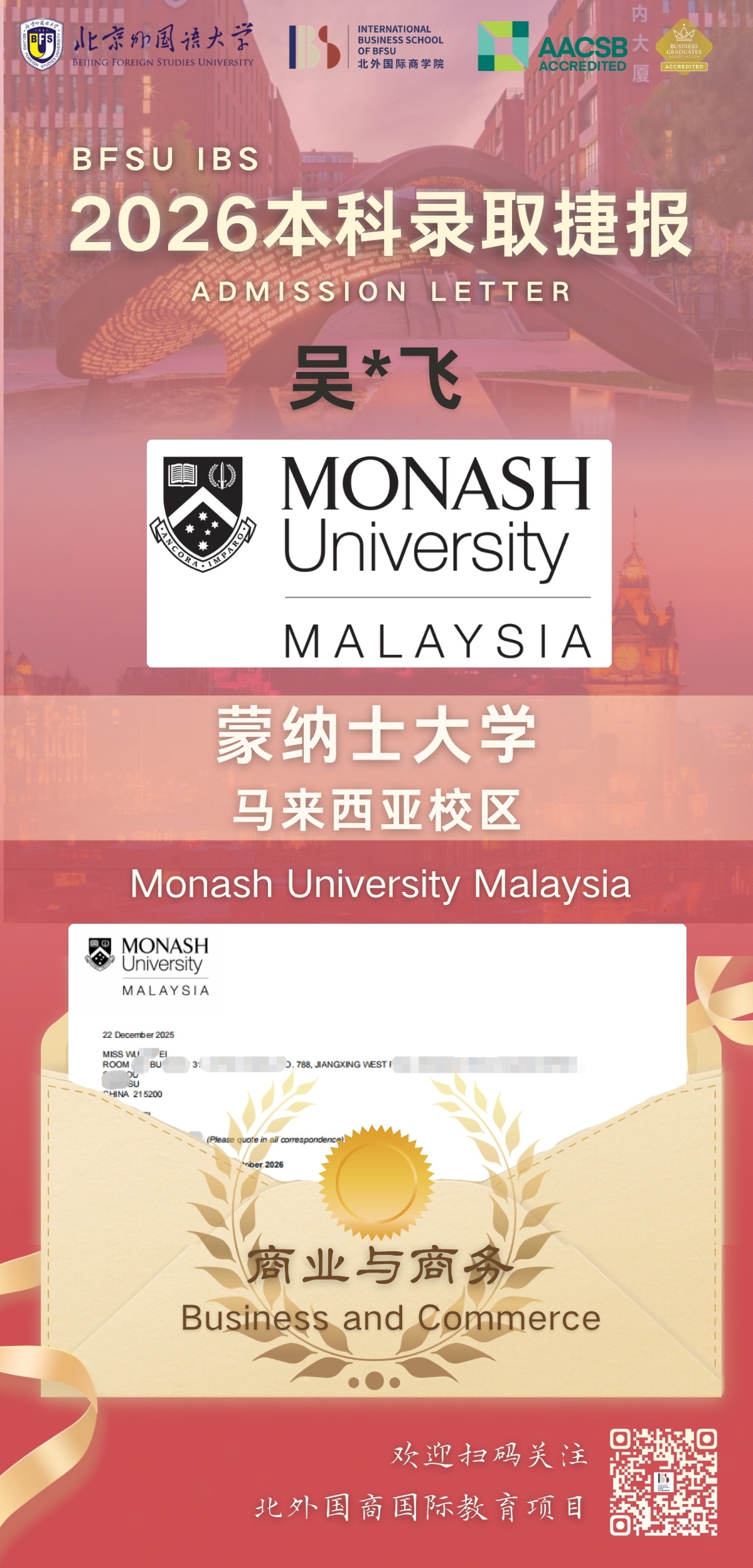 2026海外升学申请季喜讯不断传来。北京外国语大学国际商学院iMAP国际教育项目(原经济管理国际项目)再迎佳绩,项目学子收获1枚蒙纳士大学(马来西亚校区)录取通知。