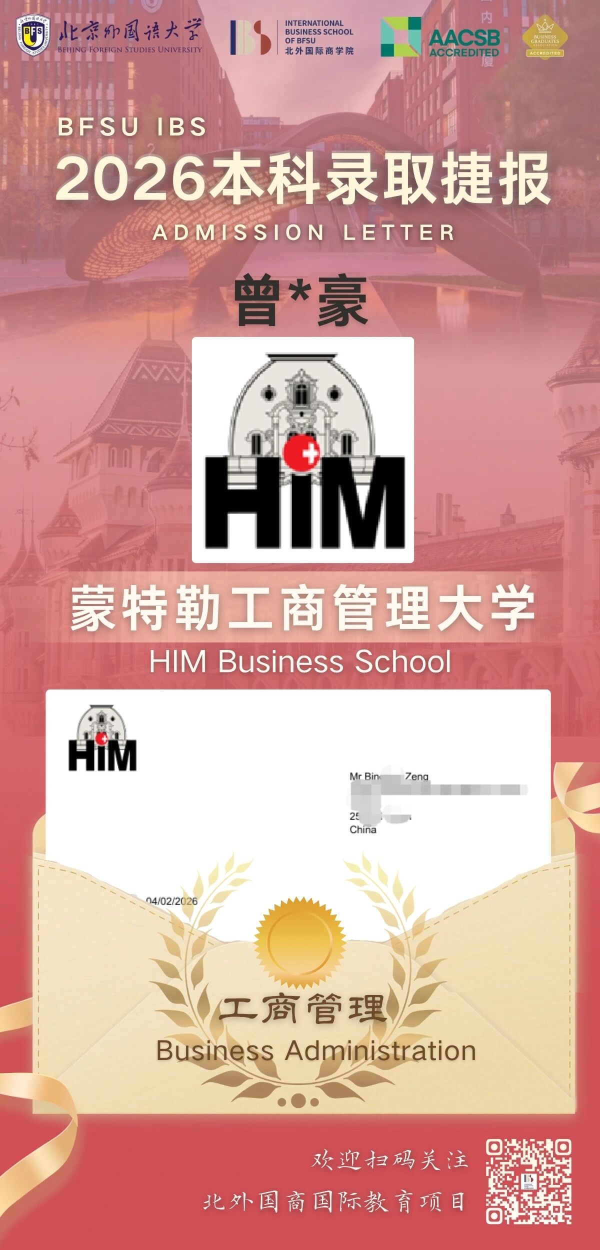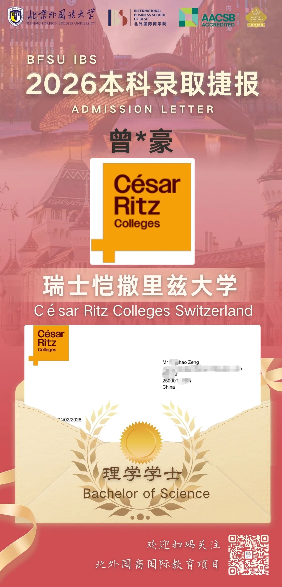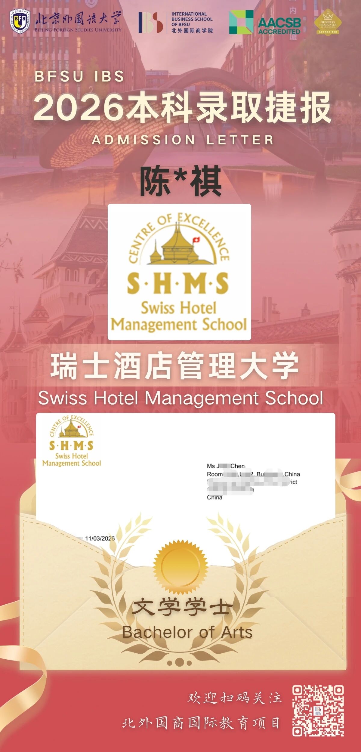 2026海外升学申请季持续传来喜讯。北京外国语大学国际商学院iMAP国际教育项目(原经济管理国际项目)再获佳绩,项目学子成功获得瑞士教育集团(SEG)旗下多所院校录取通知,涵盖酒店管理、商科及多学科方向。