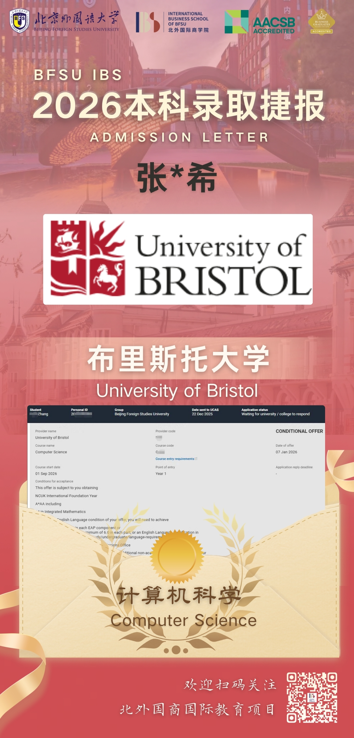 2026海外升学申请季捷报持续更新。北京外国语大学国际商学院iMAP国际教育项目(原经济管理国际项目)再获佳绩,项目学子成功斩获1枚布里斯托大学录取通知。