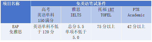 意向就读EAP课程体系的学生,开学后须参加并通过外方组织的password英语测试(雅思5.5可免试进入EAP班,雅思5分的同学,需增加EAP面试环节)。