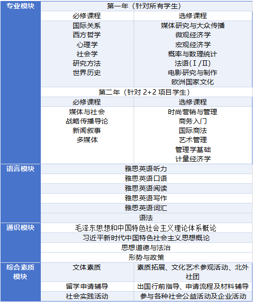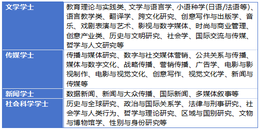 本课程体系涵盖传媒、新闻、社会科学、文学四个学士学位授予方向。具体专业参考如下: