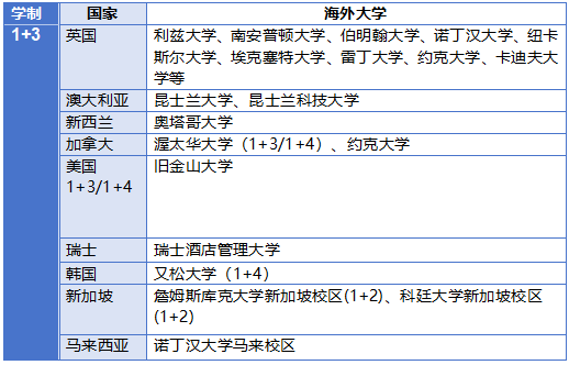 1+3:学生在北京外国语大学国际商学院修读为期一年的预科,学习英语和人文方向的专业课程;顺利完成学业并通过所有考试者,可根据语言成绩和北外课程申请转入国外合作大学。国外大学学制为3年,完成学业后获得国外大学的学士学位。