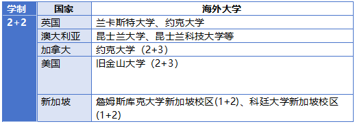 2+2:学生在北京外国语大学国际商学院修读为期2年的预科及大一课程(学习英语和人文方向的专业课程,约占国外大学总学分的1/3)。顺利完成学业并通过所有考试者,可根据语言成绩和北外课程申请转入国外合作大学继续就读大二课程。