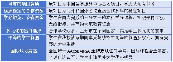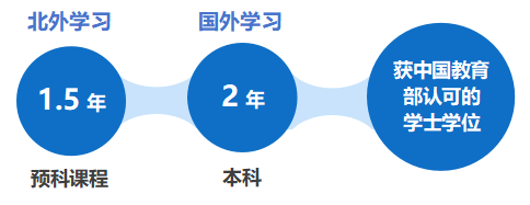 学生在我院就读1.5年的英语课程及部分商科学分课程(约占国外大学总学分的1/3),之后将转入我校国外合作大学继续学习剩余课程(约两年),完成学业后可获国外大学学士学位。