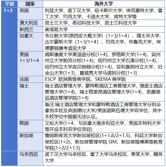 1+3:学生在北京外国语大学国际商学院修读为期一年的预科,学习英语和商科方向的专业课程;顺利完成学业并通过所有考试者,可根据语言成绩和北外课程申请转入国外合作大学。国外大学学制为3年,完成学业后获得国外大学的学士学位。